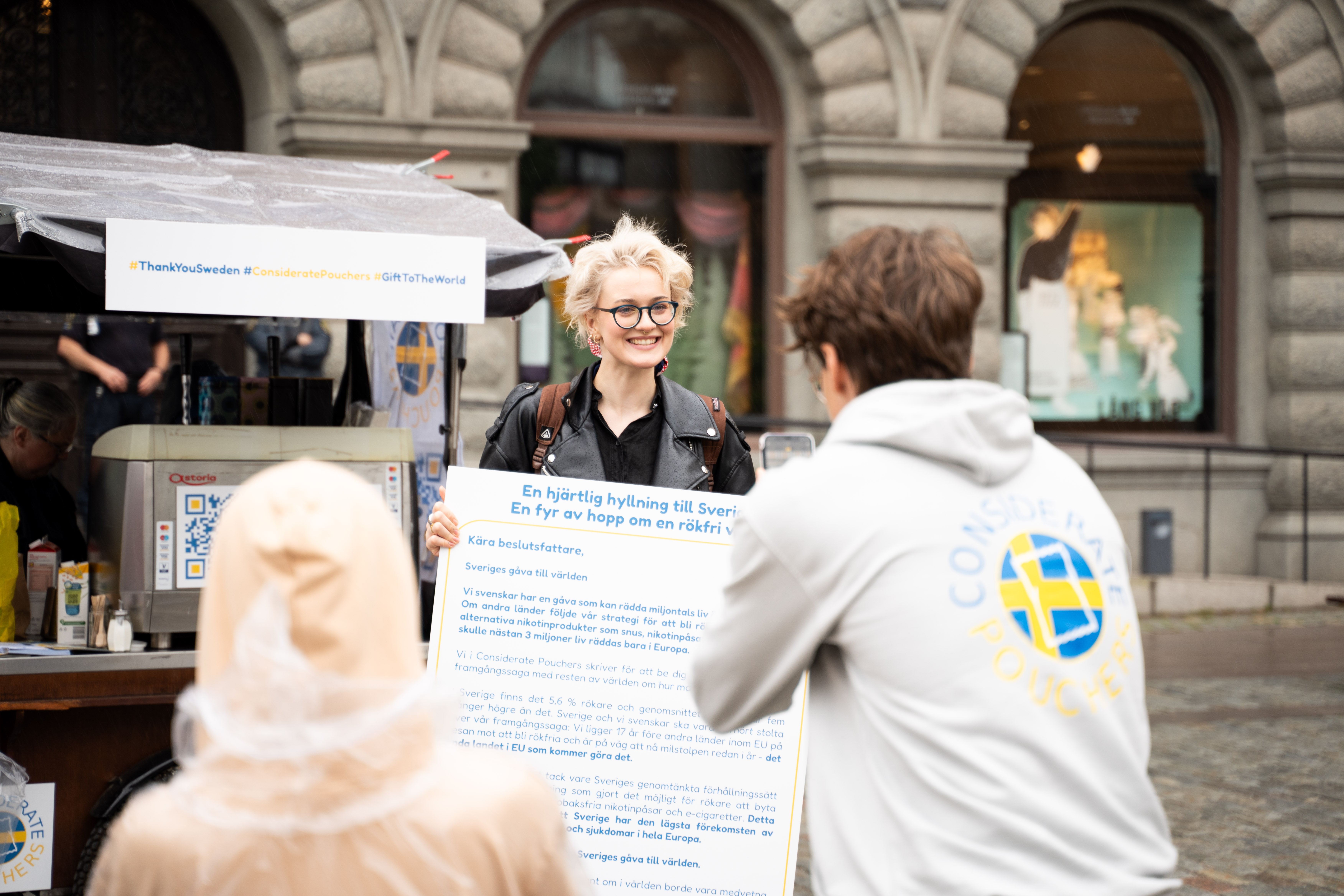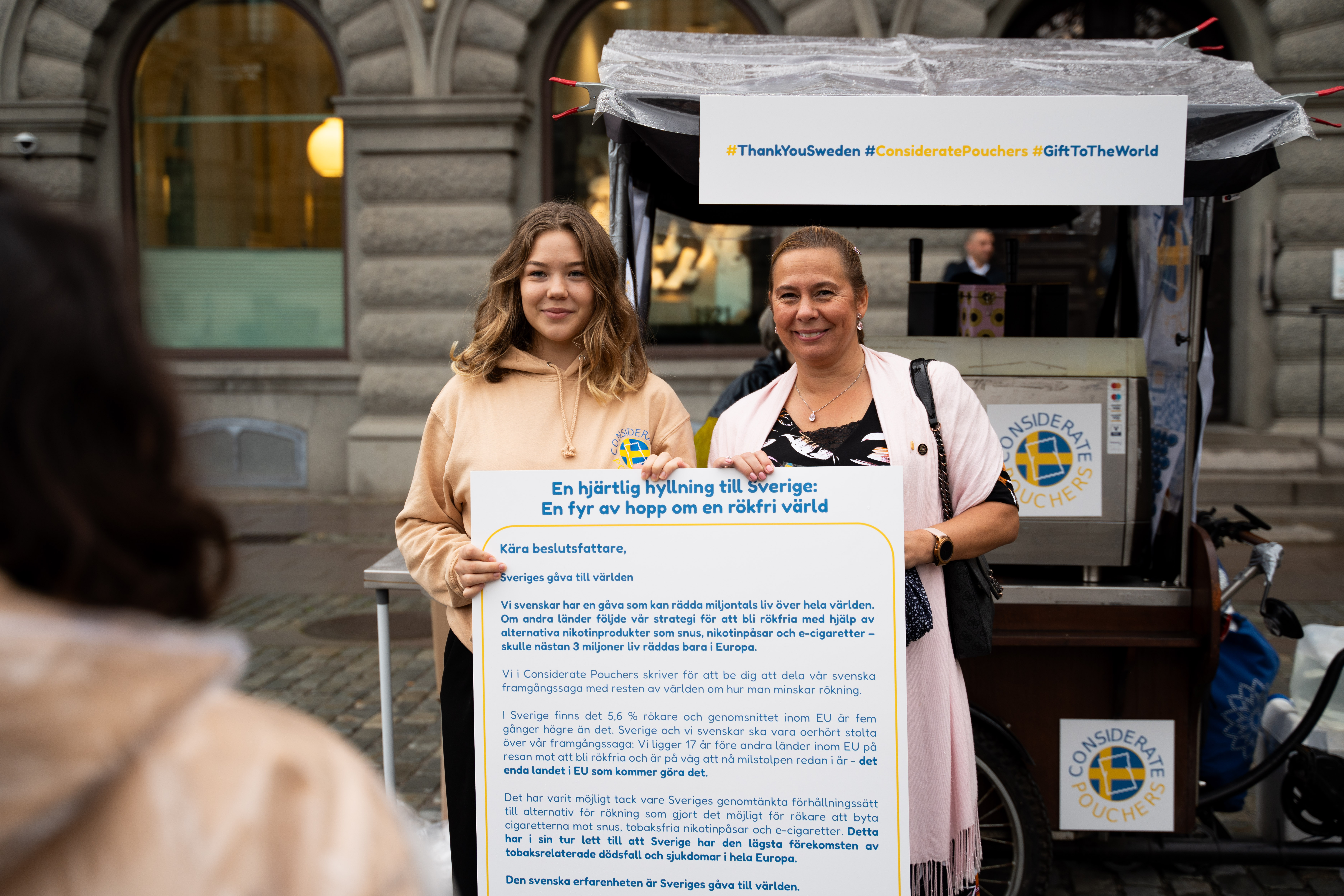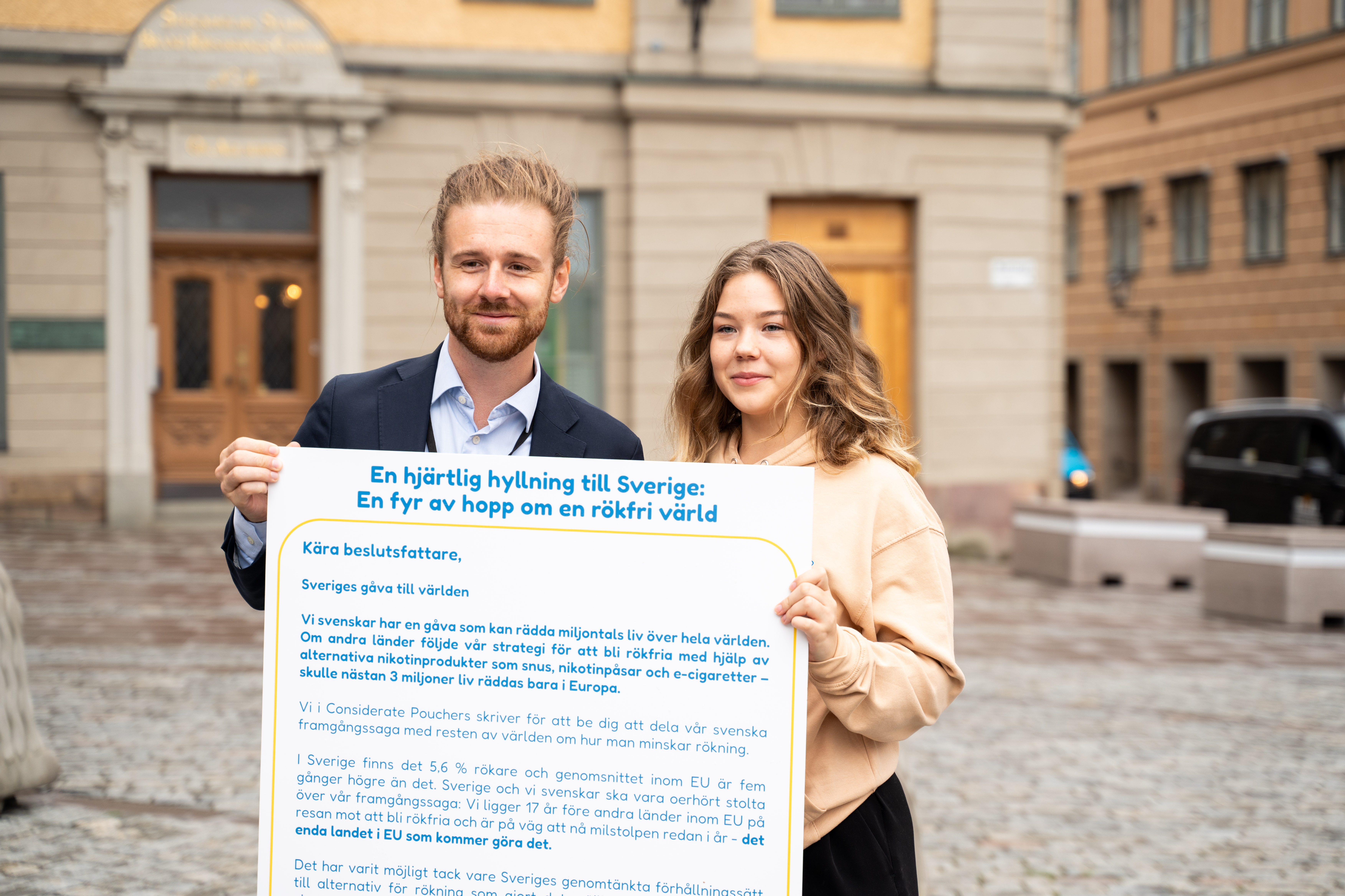 On September 13th, right outside Stockholm’s parliament, Considerate Pouchers put on a standout event to highlight and praise Sweden’s impressive harm reduction achievements. We rolled out a giant letter expressing gratitude to Sweden for setting a shining example in harm reduction for the world.
